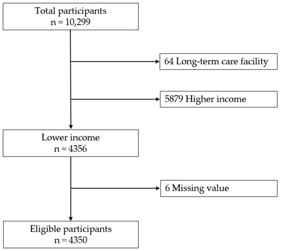 In this survey, household income was measured by totaling annual income from any (personal or public) sources. We divided our study population into five categorical income groups, called quintiles. The first quintile refers to those with the lowest income, and the fifth quintile the highest (i.e., Q1 (the lowest quintile), Q2, Q3, Q4, and Q5 (the highest quintile)). A person with ‘lower household income’ was defined as one who belonged to either Q1 or Q2. Older adults who met the following criteria were eligible: (a) lower household income, (b) community dwelling, and (c) without missing data. Finally, 4350 respondents were enrolled in this study (Figure 1).