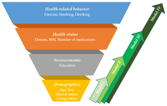 Descriptive statistics were performed using the χ2 or t-test to compare differences in the subjective health status in individual, physical, and psychological categories. After analyzing each independent variable for univariate regression, statistically significant variables were chosen to carry out multivariate regression. After that, we built new individual-variable adjusted models to reduce the potential confounding effects of individual variables. Elements from individual categories (including demographic, socioeconomic, health status, and health-related behavior subcategories) were combined into groups and were entered into regression models one by one. In designing the model, we assumed that variables in the demographic subcategory (i.e., age, sex, marital status, and living status) were the least modifiable among the four subcategories. Other subcategories, such as socioeconomic, health status, and health-related behaviors could be more easily modified (depending on one’s own effort) in consecutive order. Based on this hypothesis, we first built Model I (consisting of only the demographic subcategory), and then we encompassed easily modifiable subcategories in a stepwise way, which were presented as Models II, III, and IV (Model I: demographic variables only, Model II: demographic and socioeconomic variables, Model III: demographic, socioeconomic, and health status variables, Model IV: all the individual variables in four subcategories) (Figure 2). Odds ratios (ORs) and corresponding 95% confidence intervals (CIs) were also calculated. The statistical significance referred to a value of p < 0.05. Data were analyzed using the IBM SPSS software, version 22.0 (IBM, Armonk, NY, USA).