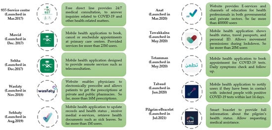 - Alassaf, N.; Bah, S.; Almulhim, F.; AlDossary, N.; Alqahtani, M. Evaluation of official healthcare informatics applications in Saudi Arabia and their role in addressing COVID-19 Pandemic. Health Inform. Res. 2021, 27, 255–263. [Google Scholar] [CrossRef]