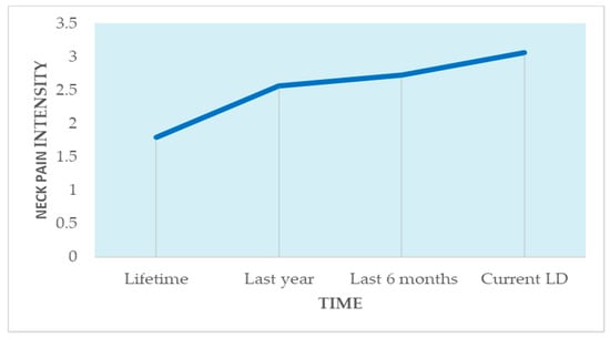 Neck pain at four time-points: lifetime, last year, last 6 months, and current, on a scale of 1–4. Abbreviation: LD: lockdown.