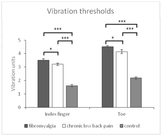 Means and typical errors for vibration thresholds at toe and index finger in the three groups of participants (fibromyalgia, chronic low back pain, and pain-free controls). * p < 0.05, *** p < 0.001.