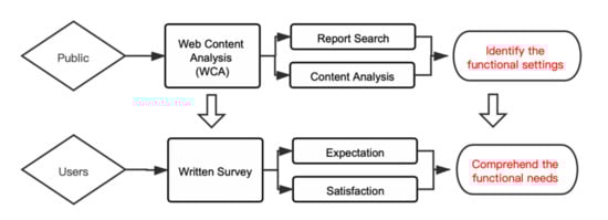 We conducted multi-method research, combining WCA [27] and a web-based survey, to investigate the perceptions on functional settings from the public and hospital occupants, respectively (Figure 1). As an instructive approach, the survey provided static, intuitive, direct data with high value density; its sample size and authenticity were limited [28]. Contrarily, the WCA provided non-instructive data, from a large sample size, dynamic, real (but low value) density [29]. The combination of two methods allowed for comprehensive understanding of the topic and drew reliable conclusions by balancing their pros and cons.
