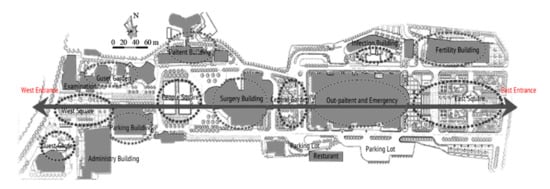 From the perspective of a built environment, an outdoor space consists of spatial elements, such as entries to gardens, layouts, pathways, seating, planting, maintenance, amenities, etc. [9]. It is associated with the efficiency and safety of a hospital by accommodating different “flow” types, such as motor vehicles and pedestrians, staff and patients, and the “clean” and “contaminated” [10]. According to the building code in China (JB110-2008), outdoor space could account for as much as 70% of an area of a hospital site, with at least 30% greenery, indicating the aesthetic, restorative, and recreational value for a hospital [7]. Outdoor space is critical for achieving improved sustainability and the microclimate quality of a hospital, which affect the comfort and health of occupants [11]. Due to the high proportion of greenery, outdoor space could cool down a building and increase the comfort levels for patients [12]. It could serve as the urban public space between hospitals and neighborhoods [13]. Nonetheless, for a long time, the value and potential of outdoor spaces contributing toward safe and resilient environments have been underestimated.
