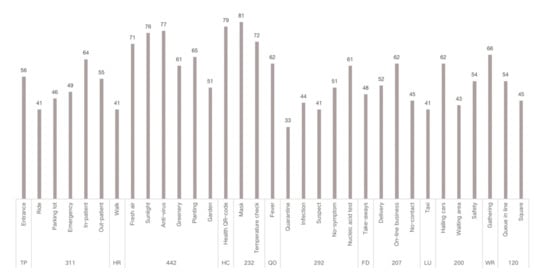 A total of 657 reports from 3 websites were obtained through WCA, and 78 high frequency words were extracted in the primary stage. After further screening and analyzing, 33 keywords of functions were identified and classified into 7 categories of functional setting (Figure 3). From the word frequency distribution and content clusters, the keywords of functions were distributed around topics of virus prevention, emergency response, waiting and resting, transportation, health restoration, and touchless practice. The top three frequency words were facemask (n = 81), antivirus (n = 77), and health QR code (n = 79), indicating the influence of the pandemic on the outdoor space.