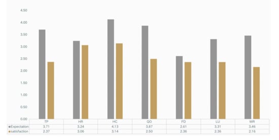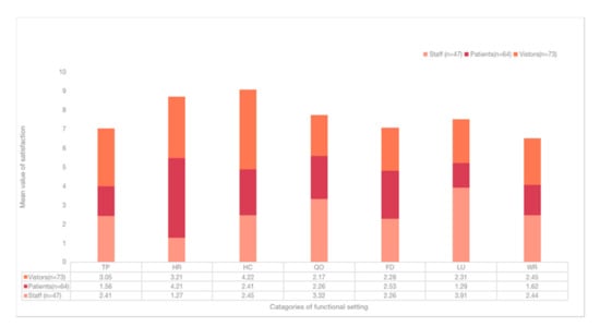 Generally, the mean value of satisfaction was lower than the expectation of the functional setting (Figure 4), indicating the low levels of satisfaction of users on the current outdoor space. HC received the highest ratings (3.14), which was less than its counterpart, in expectation. WR received the lowest ratings (2.16), indicating the low levels of satisfaction from users. Regarding the differences of groups (Figure 6), patients rated HR (4.21) the highest, and LU (1.29) the lowest. The visitors rated HC (4.22) the highest and QO (2.17) the lowest. As for staff, they rated LU (3.91) the highest and HR (1.27) the lowest. The largest differences were found in HR (2.94) and LU (2.62), which were calculated from patients and visitors.