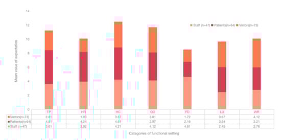HC was rated as the highest mean value (4.13), whereas FD was rated lowest (2.61) (Figure 4), indicating that HC was thought to be the most important function setting. The mean value of QO (3.87) was the second highest, next to HC, revealing the impact of the pandemic to the outdoor space. Regarding the differences of groups (Figure 5), patients rated TP (4.81) as the highest and FD (2.16) the lowest. Visitors rated WR (4.12) the highest and FD (1.72) the lowers. Contrarily, staff rated FD (4.61) the highest and LU (2.45) the lowest, which indicates the differences on FD.