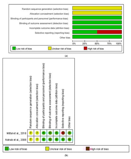 - Higgins, J.P.T.; Altman, D.G.; Gøtzsche, P.C.; Jüni, P.; Moher, D.; Oxman, A.D.; Savović, J.; Schulz, K.F.; Weeks, L.; Sterne, J.A.C. The Cochrane Collaboration’s tool for assessing risk of bias in randomised trials. BMJ 2011, 343, d5928. [Google Scholar] [CrossRef] [Green Version]