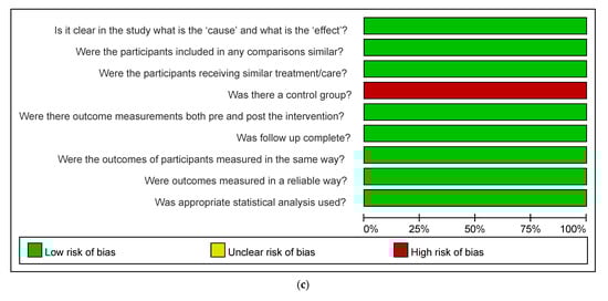 Results of assessments of risk of bias. (a) The graph indicates risk of bias of randomized controlled trials, and the questions were from the Cochrane risk of bias tool; (b) The table indicates risk of bias of randomized controlled trials, and the questions were from the Cochrane risk of bias tool; (c) The graph indicates risk of bias of non-randomized controlled studies, and the questions were from the JBI Critical Appraisal Checklist for Quasi-Experimental Studies; (d) The table indicates risk of bias of non-randomized controlled studies, and the questions were from the JBI Critical Appraisal Checklist for Quasi-Experimental Studies.