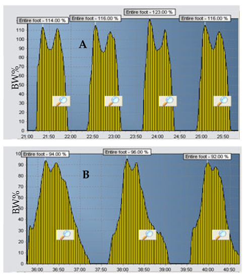 We present the vertical GRF of two patients with ischemic stroke verified through the computerised tomography (CT) scans in which percentage body weight (% BW) placed on the paretic and non-paretic legs was measured using a digital gait analysis tool (Figure 1B,C). Neither patient had any history of neurological problems that could affect walking, such as Parkinson’s or Alzheimer’s disease. Figure 2 represents the output of the entire GRF from the SmartStep™ Gait System of the paretic leg of two stroke patients, a 59-year-old and a 73-year-old, A and B, respectively. Despite the apparent similarity in the patients’ neurological gait patterns and the similar time frame (6 months post-stroke), it is clear that the GRF patterns are dissimilar; thus, different intervention approaches should be considered.