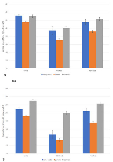 Means and standard deviations (error bars) of vertical GRF (% bodyweight) from eight gait cycles during comfortable walking for 59- and 73-year-old stroke patients (A,B), respectively. Outcomes are presented for the paretic and non-paretic legs—the vertical GRF of healthy gait is also included as a visual reference of “normality”. The GRF of healthy gait was derived from eight elderly volunteers recruited from the community who had no medical conditions that could have limited their walking ability.