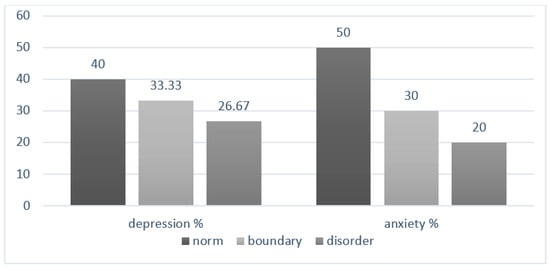 Qualitative analysis of the HADS questionnaire results showed high percentages of people with borderline values or with disorders. In the case of anxiety, half of the respondents had normative values and in the case of depression only 40% (Figure 1).