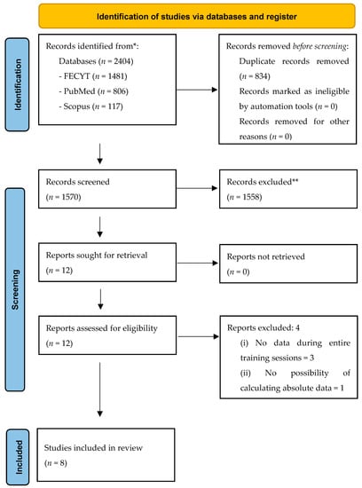 A total of 2404 (i.e., FECYT: 1481; PubMed: 806; Scopus: 117) original articles were initially retrieved from the mentioned databases, of which 834 were duplicates. Thus, a total of 1570 original articles were found. After this, a total of 1558 articles checked by title and abstract were excluded. The remaining 12 articles were checked in full text, leading to the exclusion of 3 articles according to criterion nº 1, and 1 according to criterion nº 2. Additionally, 1 article was included from additional sources. A total of 8 articles met all the inclusion criteria and were finally included in the qualitative synthesis. All the steps followed for the selection of the articles are available in Figure 1.