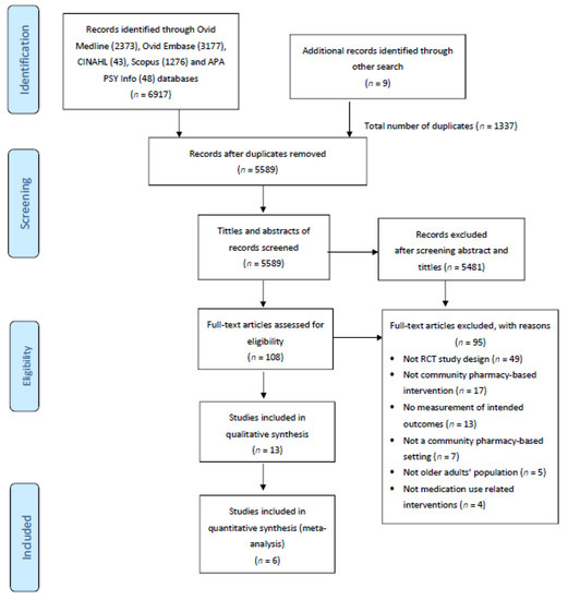 A total of 6917 articles were identified through the selected databases. Another nine articles were retrieved from other sources such as Google Scholar for grey literature, manual search in the key references retrieved, and other websites particularly the Ministry of Health Malaysia and the Malaysian Pharmaceutical Society website. After removing duplications (n = 1337), a total of 5589 articles were identified for the title and abstract screening, and 108 articles were included for further review by accessing the full texts and assessing them against the inclusion criteria. Most full texts were excluded because of a non-randomized controlled study design (n = 49) and non-community pharmacy-based intervention (n = 17). Consequently, 13 randomized controlled trials (RCT) were included in this systematic review. Reasons for the exclusion of full texts and the flow of studies are described in Figure 1. In this review, the inter-rater reliability for the final extraction between two reviewers was 0.918.