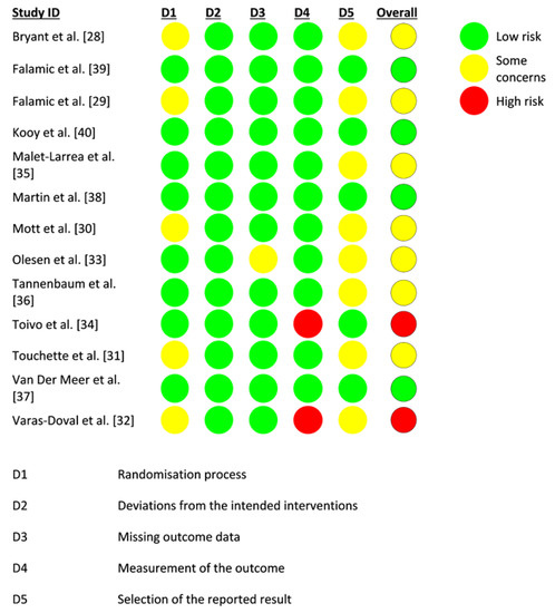 - Sterne, J.A.C.; Savović, J.; Page, M.J.; Elbers, R.G.; Blencowe, N.S.; Boutron, I.; Cates, C.J.; Cheng, H.-Y.; Corbett, M.S.; Eldridge, S.M.; et al. RoB 2: A revised tool for assessing risk of bias in randomised trials. BMJ 2019, 366, l4898. [Google Scholar] [CrossRef] [PubMed] [Green Version]