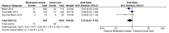 Three studies specifically examined the impact of medication review on the hospitalization of older adults [31,35,37]. In one of the studies, Touchette et al. [31] reported outcomes based on a shorter follow-up duration of three months and a longer duration of six months. The quantitative analysis showed that these three pooled studies did not show a statistically significant impact of medication review on the probability of hospitalization (risk ratio 0.72; 95% confidence interval (0.47, 1.12) I2 = 45%, p = 0.15) (Figure 3).