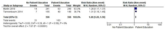 Two studies were using sedative–hypnotics (benzodiazepines) as their outcome assessment drug [36,38]. Both studies were pooled, and patient education was statistically significant for reducing the number of sedative–hypnotic users (risk ratio 1.28; 95% confidence interval (1.20, 1.36) I2 = 0%, p < 0.00001). (Figure 4).