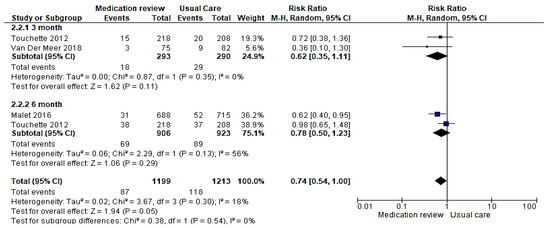 Subgroup analysis comparing studies that reported hospitalization after three months and six months medication reviews were completed (Table 2). The effect of the intervention was not statistically significant between the duration of follow-up of subgroups (risk ratio 0.74; 95% confidence interval (0.54, 1.00) I2 = 18%, p = 0.05 (Figure 7).