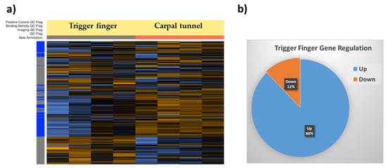 (a) Heatmap of normalized data generated via unsupervised clustering by the Nanostring nSolver software. Heatmap is scaled to give all genes equal variance. Control samples (n = 4) are organized under the orange column, and trigger finger samples (n = 4) are organized under the gray column. Within the gene clusters, orange indicates high expression, and blue indicates low expression. (b) Pie chart showing the percentage of genes up- and downregulated in trigger finger compared to carpal tunnel samples.