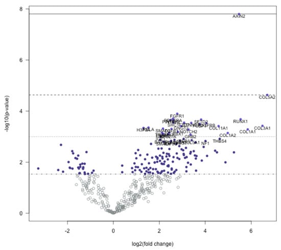 The gene with the most negative fold-change difference was MMP-3 (−3.27) with a primary impact on the transcriptional misregulation pathway. There were no collagen-transcribing genes with negative fold-change values <−1.40. Other notable genes that were downregulated included NODAL (−2.4) and LEFTY1 (0.00994), both with a primary impact on the TGF-beta signaling pathway.