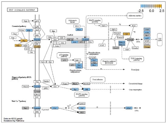 Pathview analysis done by NanoString nSolver software showing a comprehensive pathway roadmap for differentially expressed genes within WNT signaling pathways. Elements overexpressed are shown in gold, elements underexpressed are shown in blue, and elements with unchanged expression are shown in gray.