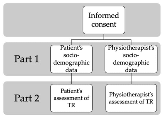 Then, the two main parts of the questionnaire followed. Their structure is illustrated in Figure 1. The first part of the questionnaire was designed to record the sociodemographic data of the participants: age, the highest diploma obtained (from secondary school to doctorate), place of residence or occupation, zip code, the existence of access to the Internet, rating of their Internet access (accessibility and quality), the location of the MSD for the patients or the number of different MSDs patients treated per week during the last 6 months, face-to-face and with TR for the physiotherapists. The second part of the questionnaire focused on several aspects related to TR. First, on the previous use of TR: