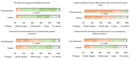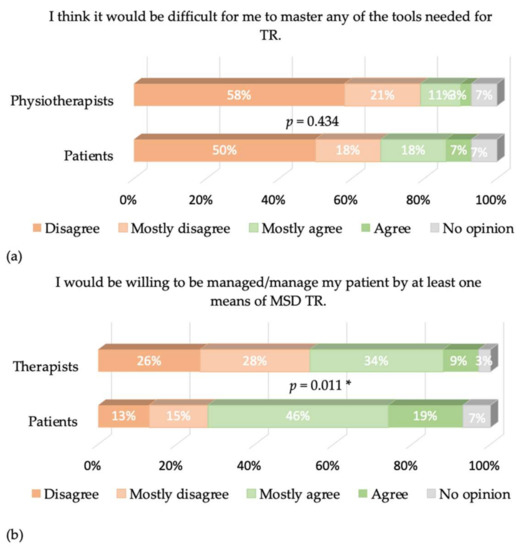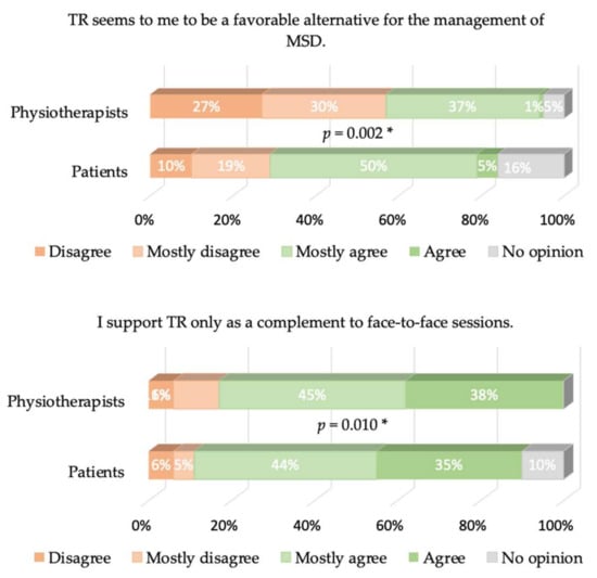 Cronbach’s α values were equal to 0.77 and 0.68 for patients and physiotherapists, respectively. The answers to the different items of our questionnaire are presented in Figure 2, Figure 3, Figure 4, Figure 5 and Figure 6, where the trends and differences between both groups can be graphically appraised. It must be noted that percentages are significantly different for all items, except the one concerning the perceived ease of use of TR tools.