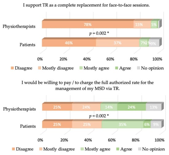 Our results show that patients are significantly less opposed to TR than therapists; time saving and sanitary safety are quoted most as advantages. We think that these findings are coherent with previous studies showing that patients agree to use TR when they have no other option, but still prefer traditional consultations [30,31,32]. It was also shown in [33] that a significant reduction in pain, anxiety and depression was possible with TR when patients worked independently. Patient autonomy is thus an important positive element of TR. According to [34], TR could finally be a good alternative to treat patients living in underserved areas. Some authors also claim that TR could reduce the hospitalization rate of patients with MSDs, since they can receive their care remotely, as well as reduce their readmission and decrease their length of stay [35].