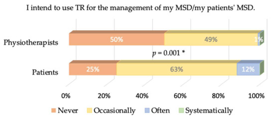 A key result of our study is that 50% of physiotherapists state that they would never use TR compared to 25% of patients, and 12% of patients would often use TR, while only 1% of physiotherapists believe this. Behavioral intention is negative overall and more salient in physiotherapists. This does not originate from the perceived ease of use of TR: The great majority of both physiotherapists and patients have satisfactory access to the internet and think that mastering the TR tools would not be problematic (79% of the physiotherapists and 68% of the patients think so). This is expected since the questionnaire was distributed using emails and social networks—the population reached is used to ICTs.