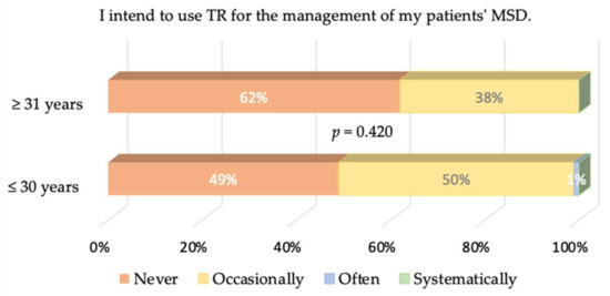 The logistic regression was logit = 0.9560 − 0.0313 age, leading to a threshold of years. We kept this value to divide our population into young (age ≤ 30 years) and old (age ≥ 31 years). We stress that the p-values associated with the intercept and the slope are equal to 0.1070 and 0.0747, respectively: although older therapists tend to answer that they will never use TR more often than younger ones, this trend may not be seen as significant. It follows that the answers of both groups to the different items were never significantly different, so we do not show all the plots for the sake of simplicity. Only the intention of both groups to use TR in the future is graphically displayed in Figure 7 for completeness.