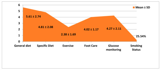 Preventing or delaying the onset of T2D can be accomplished with a balanced, nutritious diet, regular physical exercise, sustaining a healthy body weight, and keeping away from tobacco use. In addition to this, the right medications, regular screening and management for complications can all help to treat diabetes and delay or prevent the complications [5]. One of the significant aspects of DM care is perceived self-efficacy, which could lead to self-management behaviours and improve confidence among diabetic patients that they can manage diabetes. Moreover, the majority of diabetes’ care is provided by the self. Despite the excellent impact of self-care habits on chronic diseases, various studies have investigated the significance of disease control by patients themselves and indicated that self-care behaviours influence glycemic control [7,8]. Self-care refers to a patient’s utilization of their knowledge and skills to engage in healthy habits. Healthy dietary habits, physical activity, blood glucose self-monitoring, medicine and foot care are a few self-care practices [9].