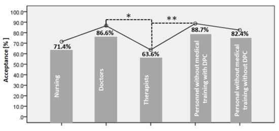 The graph presents the percentage of the potential acceptance of a COVID-19 vaccine among HCWs, n = 285, (p < 0.05 * and p < 0.005 **). DPC direct patient contact.