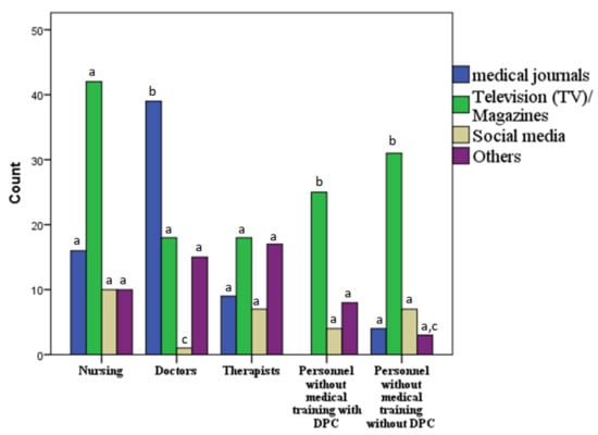 Most participants stated television (TV)/magazines (n = 134, 47.67%) and medical journals (n = 68, 27.15%) as sources of information about COVID-19. The least used sources of information for all five groups were social media and others (n = 83, 25.1%) (Figure 2). Significant differences were found in the occupation distribution between the more and less medical education level (p < 0.05). Interestingly, a significant difference in occupation was detected within the nursing and the doctors’ groups, since the latter have used the medical journal as a source of information, but nurses mainly relied on TV and newspapers (p < 0.05) (Figure 2).