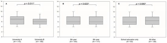 Median value for knowledge was significantly greater among students from university A (7.00 IQR 5.25–8.00) compared to students at university B (6.00, IQR 5.00–7.00, p = 0.011), as presented in Figure 1A. There was no significant difference in knowledge when students were compared relative to their study year (p = 0.0623). Both sixth and fifth year students scored a median of 6.00 (IQR 5.00–8.00), Figure 1B. Students that stated that school was their sole source of education of gout had a median of 6.00 (IQR 5.00–8.00), whereas all other students had a median of 6.50 (IQR 5.00–8.00). This difference was not significant (p = 0.680) (Figure 1C).