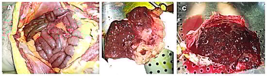 Autopsy findings. No fluid in the peritoneal cavity between the intestinal loops and no of macroscopic evident perforations (A). Macroscopic observation of the duodenum showed ulcerative lesion of the second portion with narrowing (B). The lumen of stomach was full of abundant blood clots (C).