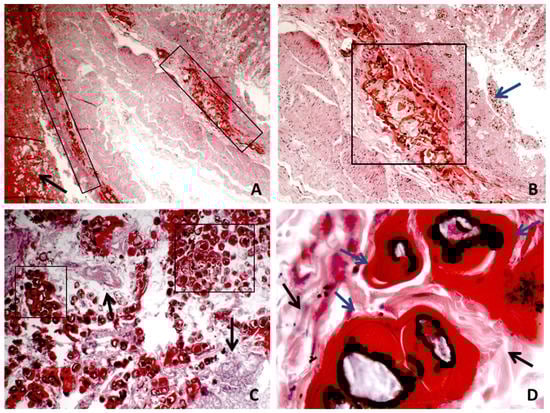 (A,B) The panoramic of wall interruption, with hemorrhage, necrosis, inflammation, and Enterobius vermicularis accumulation in different bowel sections. The black arrow indicates large areas of bleeding. The black box shows the presence of cross-sections of EV with interruption of the muscolaris mucosa. The blue arrow indicates the mucosa that is no longer recognizable cytologically due to destruction and necrosis ((A) H&E ×4 magnification; (B) H&E ×10 magnification). (C) Area with a more evident presence of EV. The black box shows cross sections of EV; the black arrow indicates the residues of the intestinal wall fragmentation (H&E ×10 magnification). (D) High magnification of the transverse sections of the EV body; the black arrow indicates the residues of the intestinal wall fragmentation and the blue arrow indicate the EV body (H&E ×40).