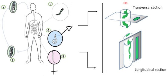 Enterobiasis or oxyuriasis is an intestinal parasitosis that mainly affects children, with predominantly anal itching and intestinal symptoms. After the ingestion of infective eggs, larvae hatch in the duodenum and descend into the crypts of the duodenum and the ileum where they develop and mutate into adult worms. In the beginning, larvae adhere to the mucosal surfaces of the small intestine, where they develop to sexually mature adult form and establish a chronic infection causing mucosal inflammation and ulceration. Then, the larvae can also penetrate the deeper layers of the intestinal wall where they establish chronic inflammation, destroying the tissue layers. Commonly, adult individuals settle in the colon from where pregnant females migrate to the perianal area at night, while the host is sleeping, to lay eggs. In fact, a diagnosis of enterobiasis in the living can be performed by applying a transparent adhesive tape in the perianal area immediately after waking up, followed by microscopic analysis. A reliable diagnosis of enterobiasis is also based on a correct intestinal sampling. Multiple samples of the intestinal wall must be taken at random in order to find the pinworms inside. In histological samples, the thick cuticles and internal organs of the worms can be easily recognizable within the intestinal wall, from the mucosal epithelium to the serosa, according to the transverse and longitudinal sections of paraffin inclusions (Figure 3).