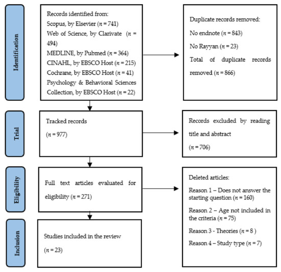 A total of 1893 studies were obtained in the search performed, in 4 June 2021: 364, from MEDLINE Complete, 215 from CINAHL, 741 from Scopus, 494 from Web of Science, 37 from Cochrane, 21 from Psychology & Behavioral Sciences Collection, and 16 from Scientific Open Access Scientific Repositories of Portugal (RCAAP). A total of 866 studies were excluded for identifying themselves in duplicate. Two independent researchers analyzed the remaining 977 articles. The title and abstract were reviewed and 706 studies were excluded, which allowed us to evaluate 271 articles for eligibility.