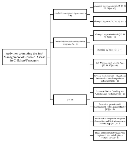 Activities related to the intervention to promote self-management of children and teenagers [2,9,27,28,29,30,31,32,33,34,35,37,38,39,40,41,42,43,44,45,46,47].