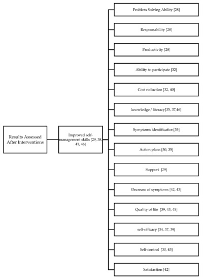 Regarding Question 5 (What results were evaluated after the intervention?), several consequences or benefits were identified in the use of interventions that promote self-management, including problem-solving ability, responsibility, productivity, ability to adhere to treatment, reduction of health costs, knowledge/literacy, identification of symptoms, construction of action plans, support, reduction of symptoms, improvement in quality of life, self-efficacy, self-control, satisfaction (Scheme 4).
