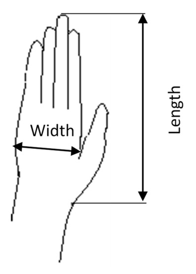 The objectives of the study were shared with the subjects before collecting the data with a full description of the test procedure. Subjects were asked to wear light clothes with bare feet and heads before the scheduled visit to take the measurements. The stature was measured using portable anthropometry from the floor to the head vertex while the subject is standing with a straight erect posture. The weights are recorded from the subjects while standing on the scale with minimum movements and hands alongside the body. The hand length and width are measured using sliding anthropometry, as shown in Figure 1.