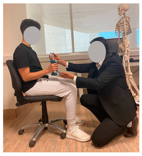 Before beginning the data collection, several days were spent to standardize the measurement techniques to reduce data collection variability to a minimum. All subjects participated in a pilot study to familiarize themselves with the gripping strength device, preferred gripping span, and testing procedure. An average temperature of 23.8 °C, relative humidity of 30.6 percent, and continuous lighting were present in the laboratory setting. While the activities were taking place, the experimental site was guaranteed to have no noises or heavy odors. Before the actual test, the participants performed several trial tests at five different grip span settings on the dynamometer to determine their ‘preferred grip span’, for which they felt comfortable and could produce their maximal grip strength. The participants were once again permitted to try the spans one above and one below the preferred span after the initial determination of the preferred span to ensure it that was the one the participant preferred. The Grip strength values were recorded in the morning (9 a.m.–12 p.m.) according to the protocol recommended by the American Society of Hand Therapists [4,60]. This protocol is described as “the sitting position for this recording was sitting in a straight-backed chair with the feet flat on the floor, the shoulder adducted and neutrally rotated, elbow flexed at 90 Degree, and forearm and wrist in a neutral position” as shown in Figure 2.