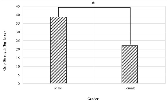 Effect of gender on the grip strength (* means there is a significant difference between levels).