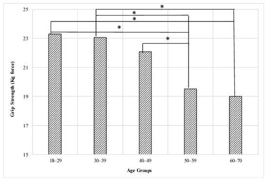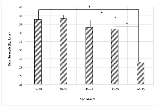 Effect of the age group on the grip strength of the male (* means there is a significant difference between levels).