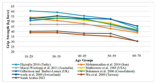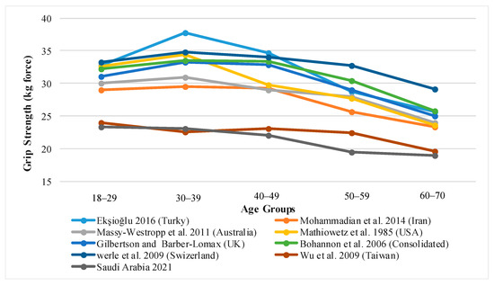 As a matter of fact, handgrip strength comparisons between regions may shed light on historical regional variances in genetic variables, dietary inadequacies, and/or sociocultural environments [71]. When the grip strength of Saudi adults (of any gender) was compared to the grip strength of Taiwan adults, no significant differences were found. However, grip strength in other societies, such as the United States, the United Kingdom, Turkey, Iran, Switzerland, Australia, and a common database of Western countries, differ significantly in all age groups, as shown in Figure 5 and Figure 6. The population of these countries has a higher average grip strength in both sexes than the Saudi population. According to Kamarul et al. and Xiao et al., there is a considerable difference in grip strength between Malaysian adults and Chinese adults with Western dominance [55,72]. The likelihood is that the variations in grip strength normative data values are due in large part to the disparity in anthropometric parameters. Physical characteristics such as height and weight depend on the type of race [73]. As a result, the vast disparity in grip strength between Saudi and Taiwanese populations and Western, Turkish, and Iranian [74] populations is due to racial differences. The influence of race can be so strong that it can overshadow the influence of other important factors such as diet, socioeconomic status, and cultural group. The significance of the race impact was demonstrated in a study conducted by Anjum et al., in which the geographical and socio-economic variables of the comparable populations were examined. It was discovered that British individuals had a statistically significant dominance in all grip strengths when compared to Asian people among the residents of West Yorkshire, England, which had a predominantly British population and a large proportion of Asian people [75].