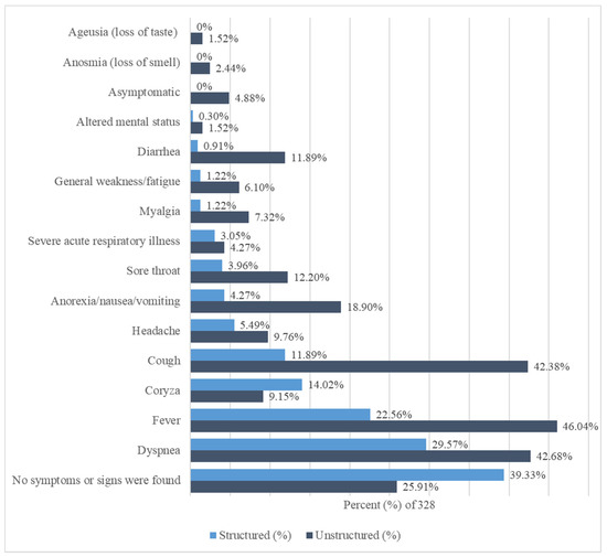 We observed variations in the documentation and prevalence of reported signs and symptoms between structured and unstructured data (Figure 2 and Table A3). The total number of reviewed unstructured was 3348 notes, which were found in triage notes, nurse notes, ER notes, infection control notes, radiology reports, and consultant notes. Documentation of symptoms was higher in unstructured data (n = 725) than in structured data (n = 323). In structured data, the top five frequent symptoms were dyspnea (n = 97, 29.57%), fever (n = 74, 22.56%), coryza (n = 46, 14.02%), cough (n = 39, 11.89%), and headache (n = 18, 5.49%). However, symptoms of ageusia (loss of taste) and anosmia (loss of smell), as well as those asymptomatic were not reported in structured data. In unstructured data, the top five frequent symptoms were fever (n = 151, 46.04%), dyspnea (n = 140, 42.68%), cough (n = 139, 42.38%), anorexia/nausea/vomiting (n = 62, 18.90%), and sore throat (n = 40, 12.20%). There were no reported symptoms found in (n = 129, 39.33%) of structured diagnoses compared to (n = 85, 25.91%) found in unstructured clinical notes. Overall, the reporting of symptoms was higher in unstructured data than in structured data.
