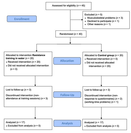Thirty-four women over 65 years of age (67 ± 4.31 years) from the province of Alicante, Spain, participated in the study. The inclusion criteria were as follows: (a) female participants; (b) over 65 years of age; (c) non-institutionalized older women; (d) who had the autonomy to travel from their residence to the municipal swimming pool; (e) individuals who gave their permission to participate in the study by signing the consent form; (f) individuals with medical authorization for the practice of physical exercise in an aquatic environment. Exclusion criteria were (a) being under 65 years of age; (b) having completed a physical exercise program; (c) suffering from musculoskeletal, neurological, or orthopaedic diseases that could affect the ability to perform the tests; (d) not being able to walk independently without orthopaedic assistance; (e) having previously performed the tests included in the study; and (f) be receiving a pharmacological treatment that may influence the results of the investigation. Over the follow-up period, six participants withdrew from the trial. Seventeen women participated in the experimental group and seventeen in the control group. All withdrawals were due to personal reasons (Figure 1).