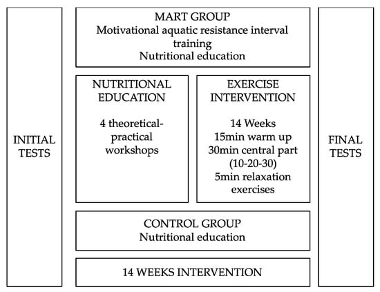 Prior to the intervention, a first session was held where the participants were given different tests (pre-test). After the intervention, another evaluation was carried out to determine the effect of the intervention (post-test) (Figure 2). The MART group performed an aquatic resistance and motivational training, and the control group did not perform any type of exercise. The water temperature was approximately 29 °C (84 °F), and the minimum water depth was considered 1.3 m.