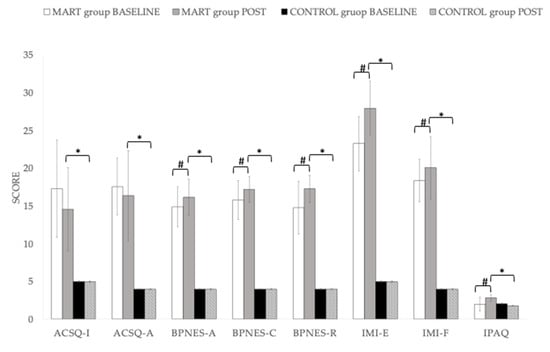 Sample characteristics at baseline and post-intervention. ACSQ-I = ACSQ Interest in the athlete’s opinion; ACSQ-A = Assessment of autonomous behavior; BPNES-A = Basic Psychological Needs in Exercise Scale—Autonomy; BPNES-C = Basic Psychological Needs in Exercise Scale—Competence; BPNES-R = Basic Psychological Needs in Exercise Scale—Relationship with others; IMI-E = Intrinsic Motivation Inventory—Enjoyment; IMI-F = Intrinsic Motivation Inventory—Effort; IPAQ = International Physical Activity Questionnaire; * = Significant difference between MART group vs. control group; # = Significant difference baseline vs. final. Differences were significant at p < 0.005.
