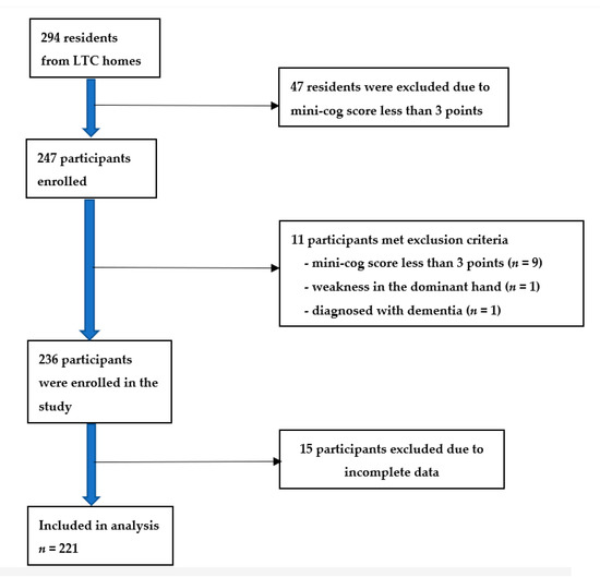 We enrolled residents aged over 60 years in LTC homes who were able to communicate orally in Thai. The total number of residents in Thailand in 2021 was 1292 in 12 government’s LTC homes all over Thailand [34]. The inclusion criteria included LTC residents who were: (1) aged 60 years old or higher, (2) able to understand and communicate in Thai, and (3) able to complete questionnaires on their own. We excluded residents who had: (1) weakness in the dominant hand, hearing loss or visual loss to a degree that interfered communication, (2) received a diagnosis of dementia, and/or (3) obtained a Mini-Cog score of less than 3 points [35,36]. Of 294 residents recruited, 247 participants were enrolled, 11 participants met the exclusion criteria, and 15 participants had incomplete data. Finally, we obtained 221 participants for this analysis (Figure 1). All the participants were asked to complete the questionnaires. Informed consent was obtained from all participants from the beginning before proceeding to further steps. This research was approved by the Ethics Committee of the Faculty of Medicine, Chiang Mai University, Thailand.