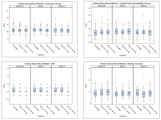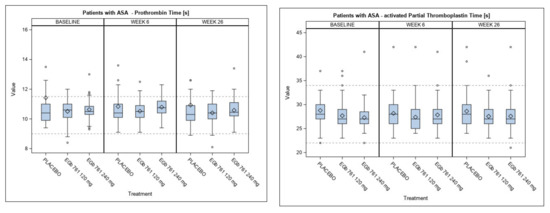 | APTT [s] | Baseline | 9 | 40.4 [36.0] | (11.3) | 5 | 34.6 [32.0] | (6.1) | 4 | 35.5 [33.5] | (6.1) | 0.216 |